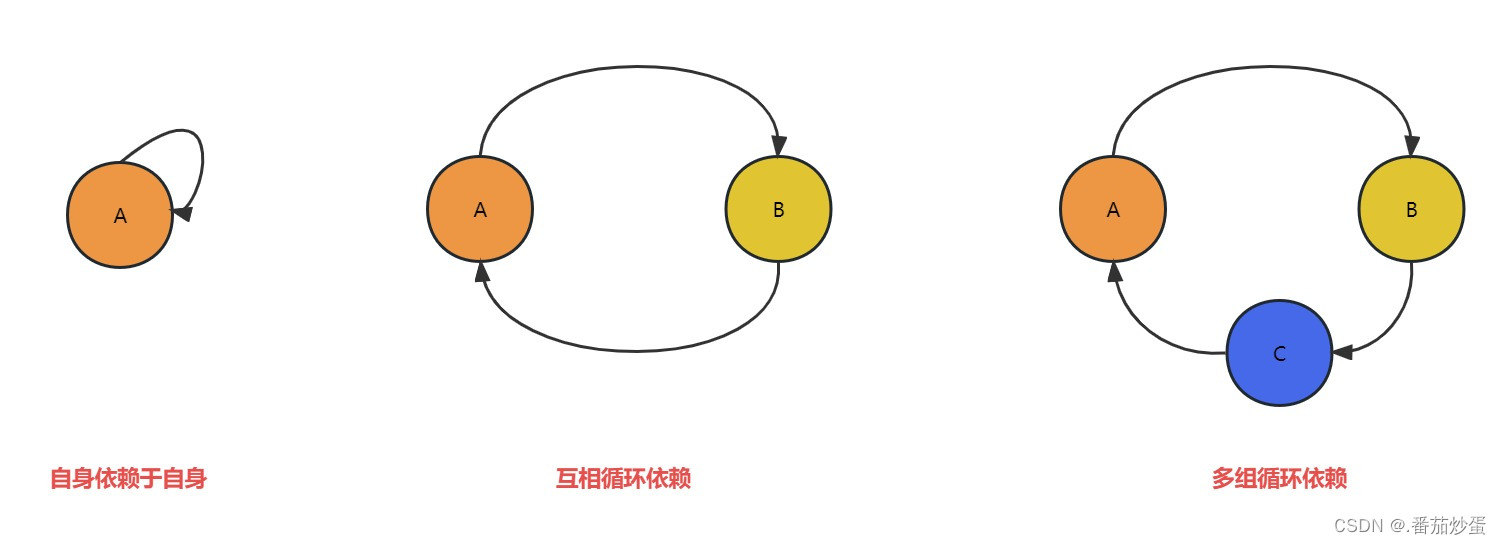 上图就是循环依赖的三种情况,虽然方式不同,但是循环依赖的本质是一样的,就A的完整创建要依赖与B,B的完整创建要依赖于A,相互依赖导致没办法完整创建造成失败.