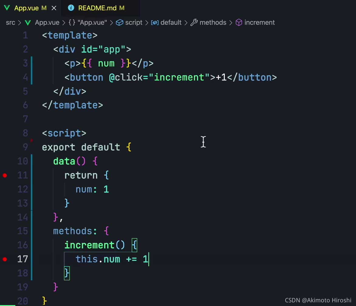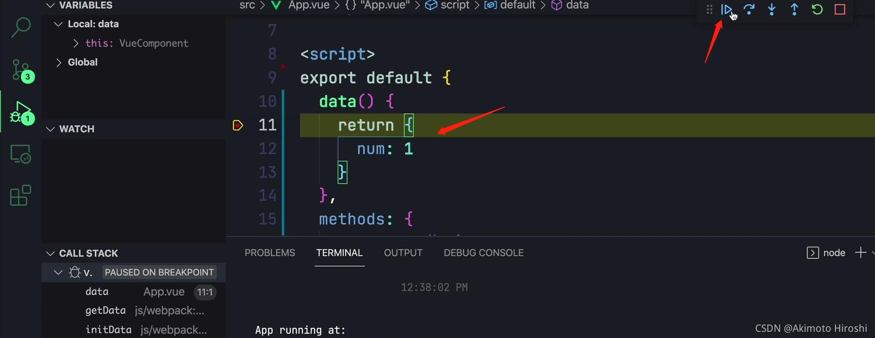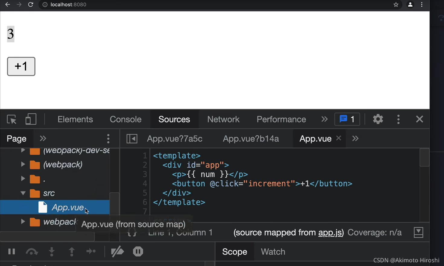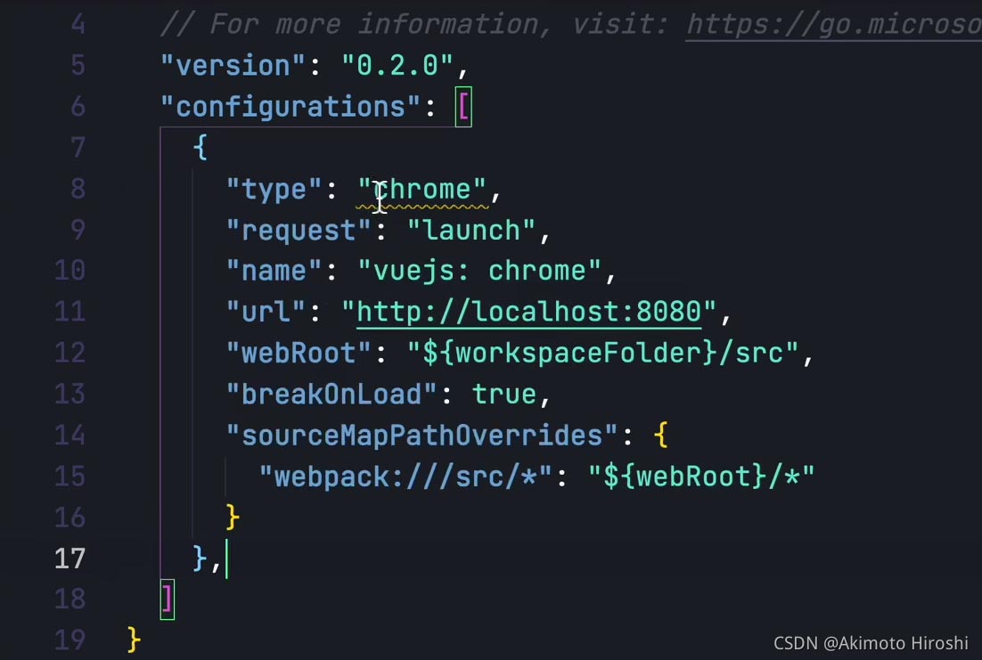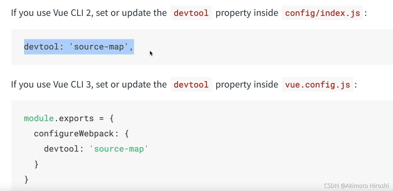 对于这样的代码,我们打两个断点,想要调试的话,需要在项目根目录,新建一个文件:vue.config.js,然后根据Vue Cli脚手架版本,分别写入不同的webpack配置: