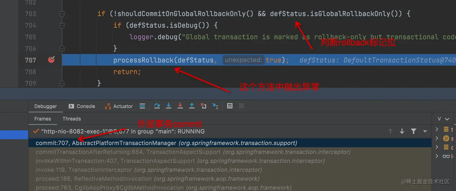 3.transaction1()由于try catch 异常,正常运行,想必就要可以提交事务了,在提交事务的时候,会检查rollback标记,如果是true, 这时候就会抛出上面的异常了。源码如下图所示: