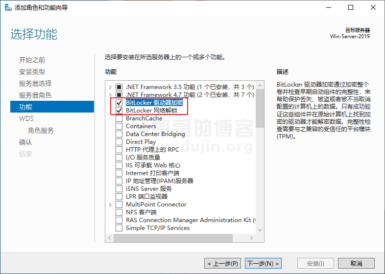 分别把BitLocker 驱动器加密和BitLocker 网络解锁这两个勾选起来。