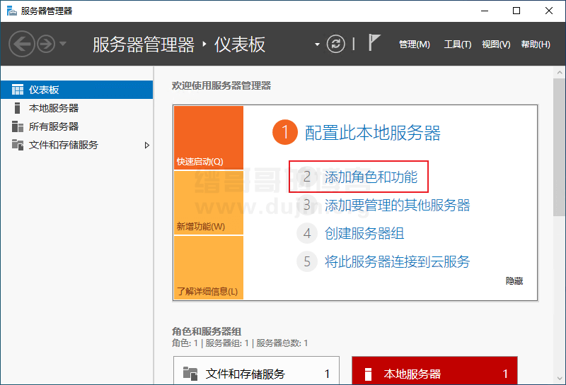 首先运行 Windows Server 服务器管理器,点击添加角色和功能。