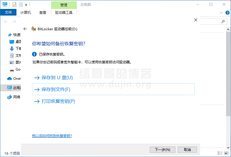 由于 BitLocker 驱动器加密难以破解,一定要把 BitLocker 恢复密钥保存好,这里建议选择保存到文件或者保存到 U 盘,同时把这个密钥在别的地方也备份一个,免得丢了之后再也找不回来。