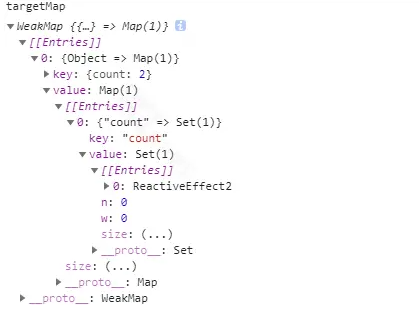 targetMap是一个WeakMap,它的键是target,值是一个Map,这个Map的键是key,值是一个Set;