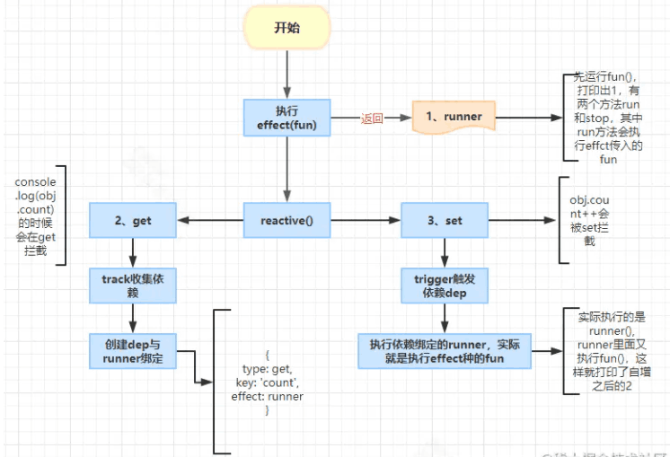 // 先执行 fun() // 打印出1 const runner = new ReactiveEffect(fn) return runner runner: { run() { this.fun() //执行fun }, stop() { } }