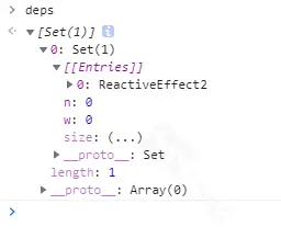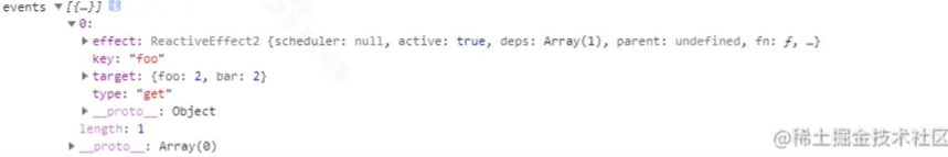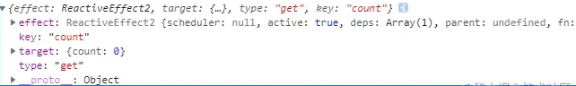 [ { effect: runner, // effect 函数的返回值 target: toRaw(obj), // 表示的是哪个响应式数据发生了变化 type: TrackOpTypes.GET, // 表示此次记录操作的类型。 get 表示获取值 key: 'foo' } ]