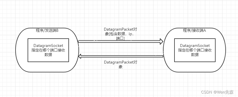 - DatagramPacket对象封装了UDP数据报,在数据报中包含了发送端的IP地址和端口号以及接收端的IP地址和端口号。
