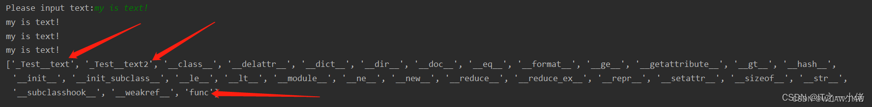 class Test(object): def __init__(self, text): self.__text = text self.__text2 = text def func(self): print(self.__text) def __str__(self): return self.__text text = input("Please input text:") obj = Test(text) print(obj) obj.func() # print(obj.__text) # 报错 print(obj._Test__text) print(dir(obj))