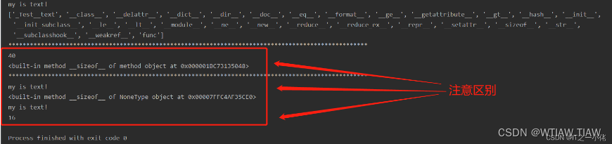 class Test(object): def __init__(self): self.__text = "my is text!" def func(self): print(self.__text) def __str__(self): return self.__text obj = Test() print(obj) print(dir(obj)) print("*" * 100) print(obj.func.__sizeof__()) print(obj.func.__sizeof__) print("*" * 100) print(obj.func().__sizeof__) print(obj.func().__sizeof__())