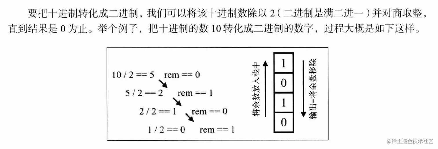 * 1. 用十进制数除以 2,得到的余数存入栈中,得到的商继续除以2 得到的余数继续存入栈中,直到商为 0 为止。