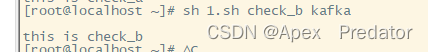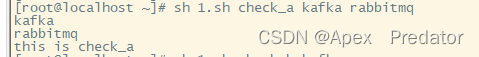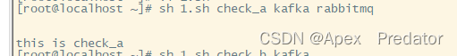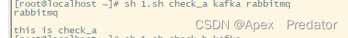 可以看到check_a脚本输出了$2变量参数,但是$2输出的参数是有问题的,$2输出了rabbitmq,这个参数应该是$3变量输出才对,然而$3变量参数输出为空,kafka参数依旧没有输出,check_b脚本输出的$2参数也依旧是空