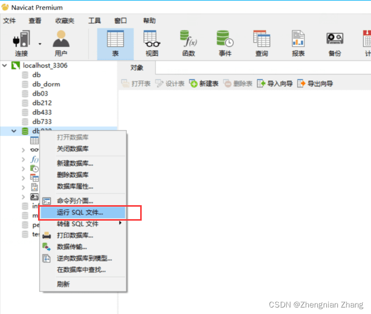 3:创建完成后,在左侧便会出现db838,接下去是最关键的一步:右键点击db838,点击“运行sql文件”