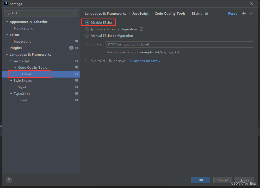 但是这看着就很不舒服,可以把ESLint检测关闭(按一下步骤操作就行)