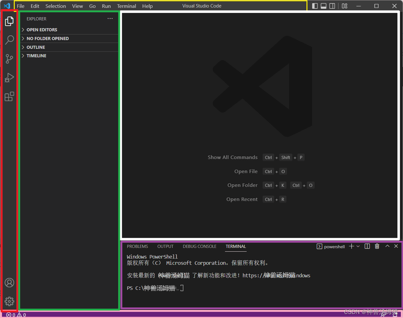 黄色 | 菜单栏 | 进行VSCode的各项操作 |