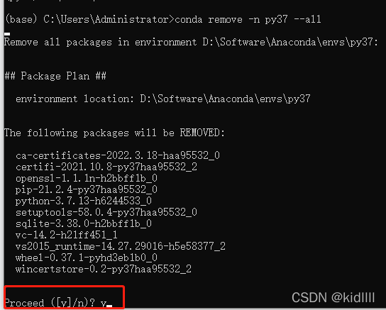 输入y(yes),即可删除环境以及环境中的所有packages