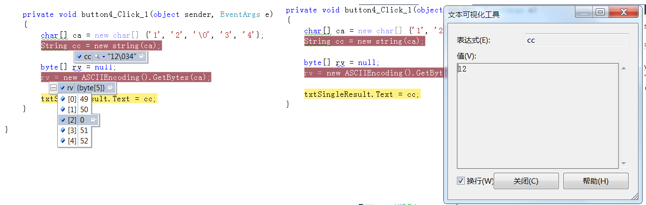 如下图所示,构造一个字节数组,其中含有’\0’字符,在程序运行时通过跟踪可以看出: