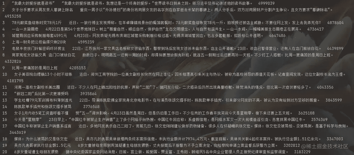 这样,我们就得到了我们想要的内容,比如讲,新闻的标题啊,热搜第几啊什么的。我们来看看效果。