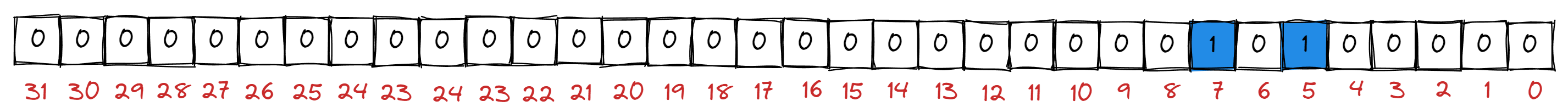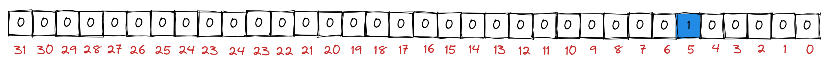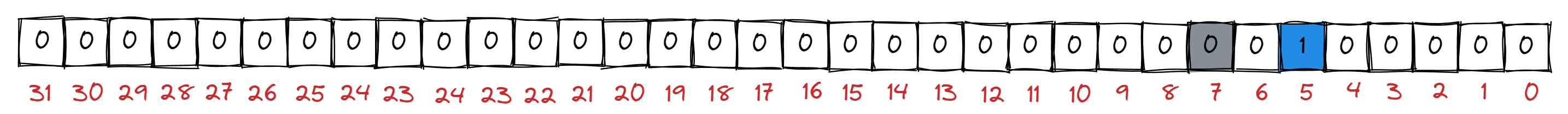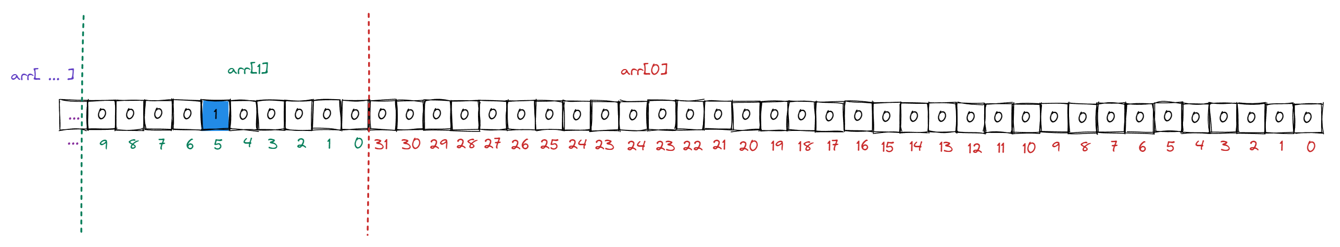 例如当 num = 37 时, num 应该在数组 1 号 (即: 37 / 32) 下标的元素的第 5 个 bit (即: 37 % 32) 位上.