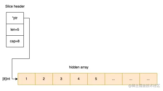 在上面的例子中,切片 slice 的长度为2,因为它包含了数组中索引为1和2的两个元素。切片的容量为4,因为它底层数组的大小为5,从索引1开始的剩余空间为4。