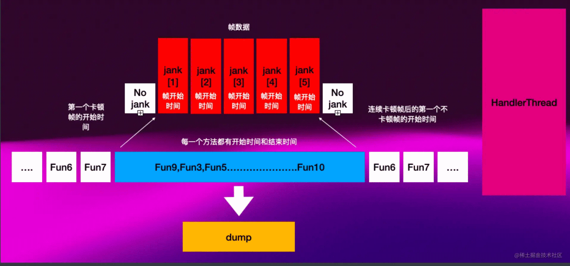 由于HandlerThread接受帧数据的时机是不确定的,即可能方法数据已经收集到很多帧以后了,但是帧数据才刚刚到来。如何精准定位到卡顿范围内的全部函数