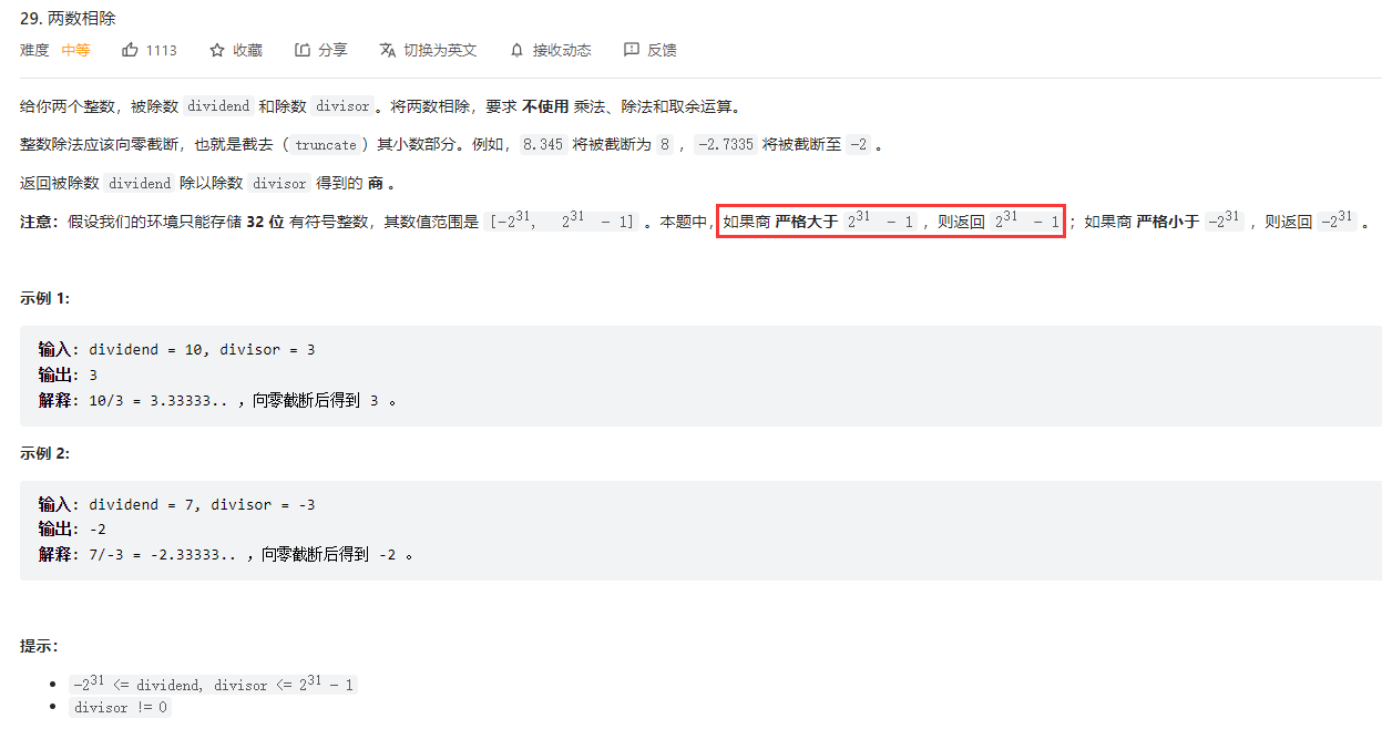 3.如果被除数 (a) 为系统最小值, 除数为 -1 时, 根据 LeetCode 题目要求, 结果就是Integer.MIN_VALUE / (-1) == Integer.MAX_VALUE;