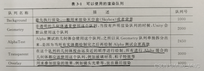 在SubShader中可以使用Queue(队列)标签确定物体的渲染顺序,Unity定义了五种渲染队列,如下: