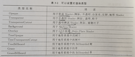 RenderType标签可以将Shader划分为不同的类别,用于后期进行Shader替换或者产生摄像机的深度纹理,具体如下: