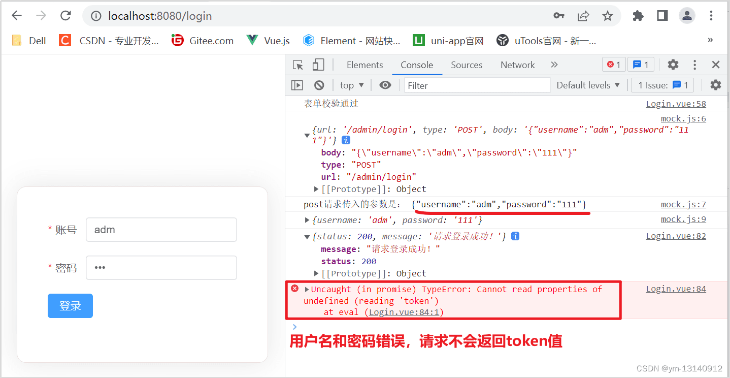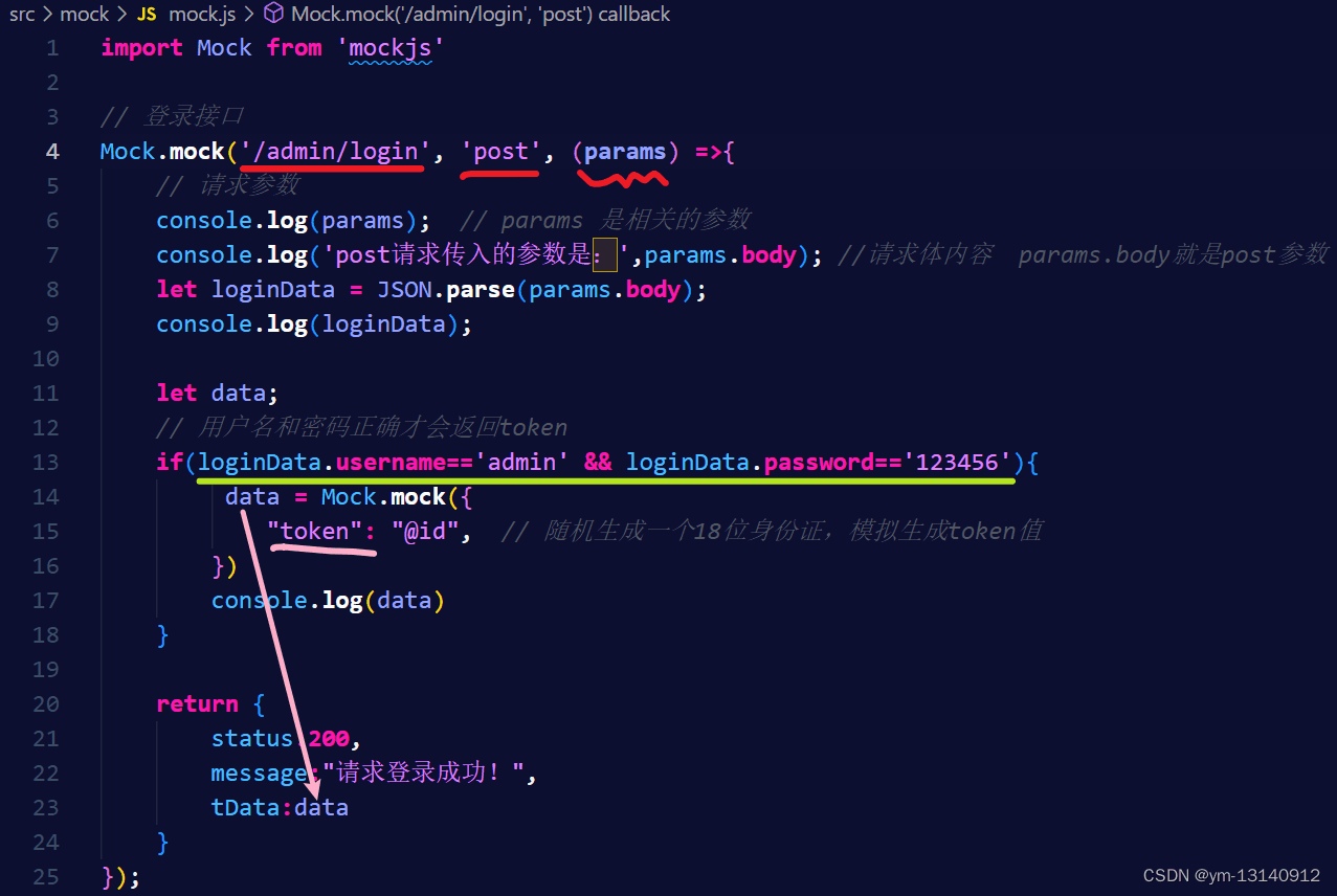 然后在mock登录请求中限制一下用户名和密码,两者输入正确才能获取到token。token值利用Mock随机函数中来生成。