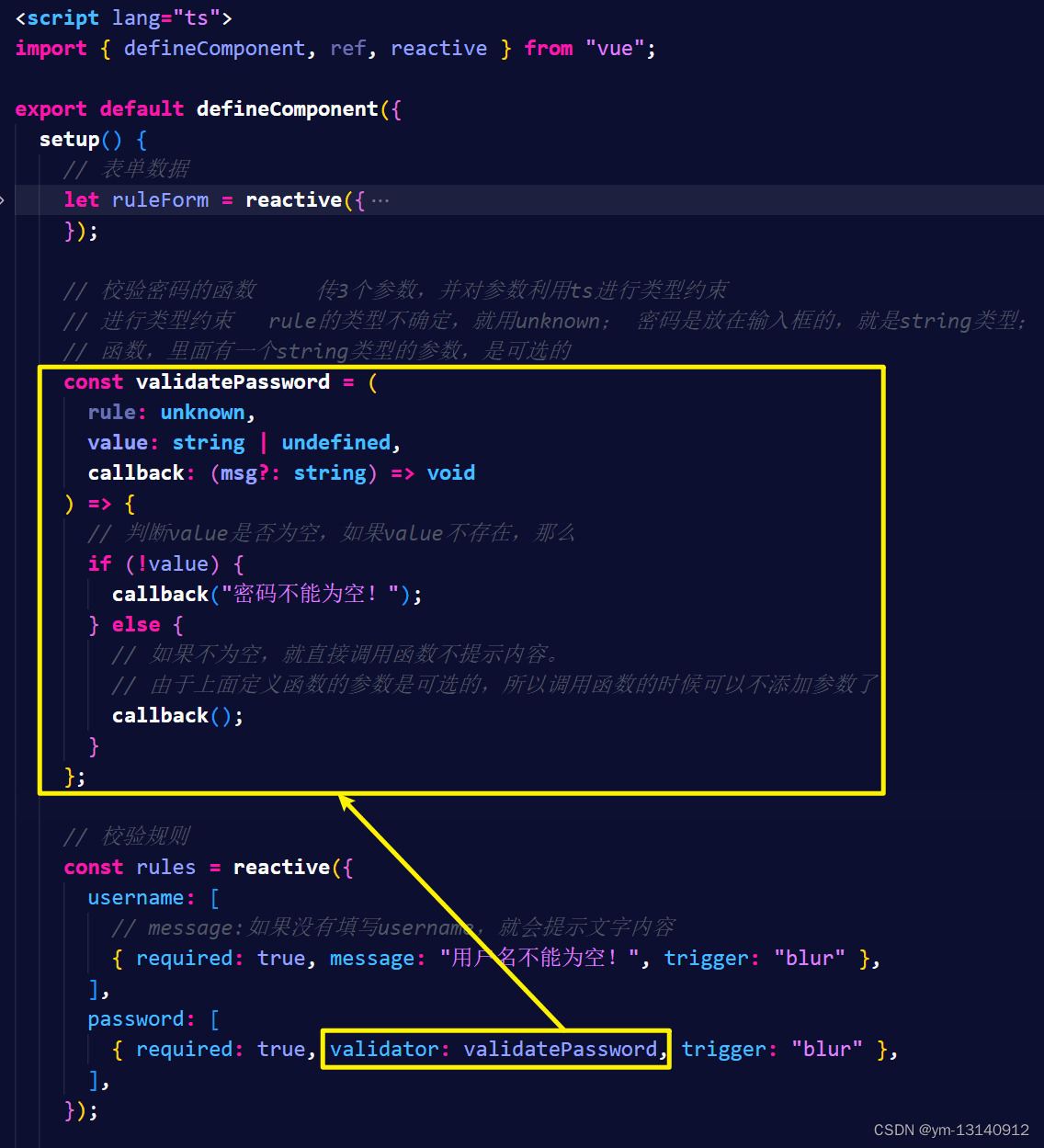 这个表单节点叫做ruleFormRef,由于setup中是没有this的,我们不能像Vue2中,通过this.$refs.xxx来获取节点。我们去setup中利用ref再重新定义一个相同名称的变量就可以,然后,它们就会自动关联起来。