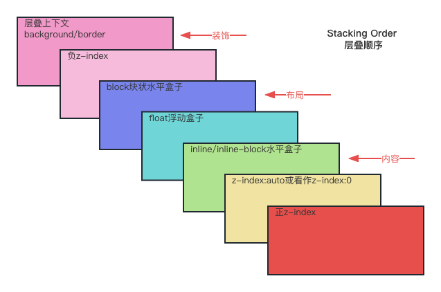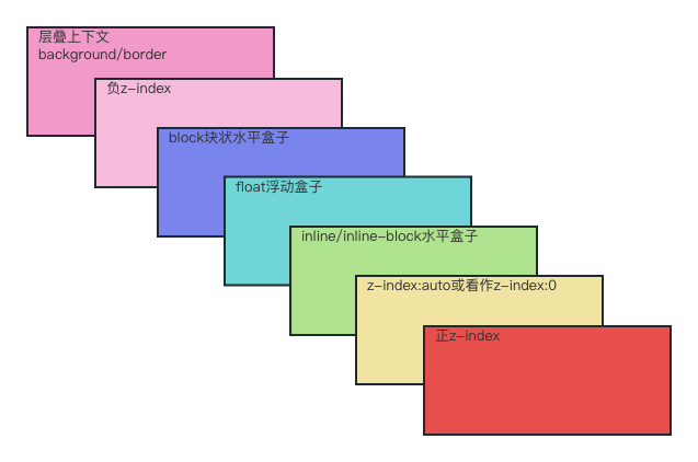 在一个层叠上下文中按照层叠顺序把元素分为7种层叠水平,默认的层叠顺序如下图所示: