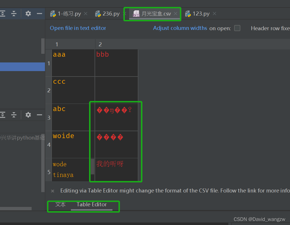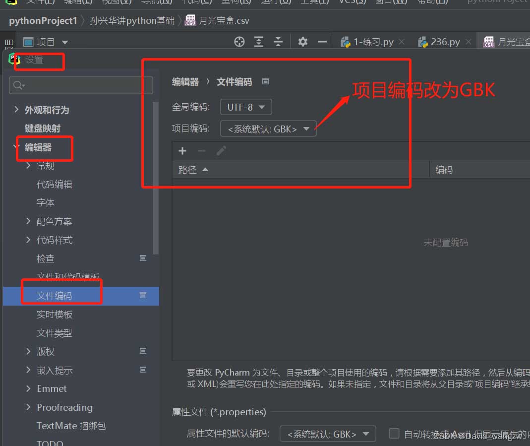 (一)CSV 出现了乱码:方式有两种,一种是读取数据的时候对数据格式进行转换。另外一种就是从设置里面对“项目编码格式”进行设置。