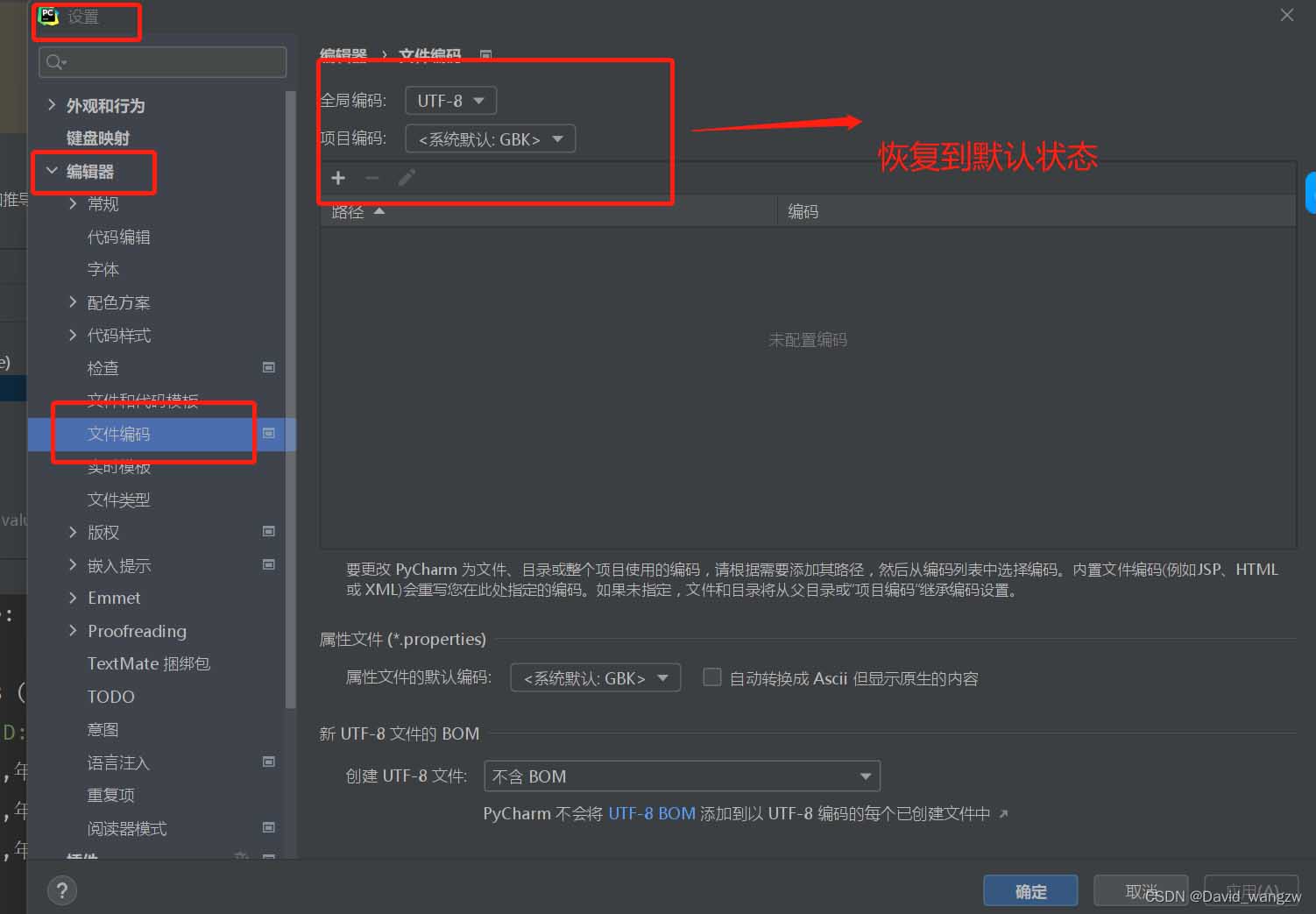 1.打开设置—编辑器—文件编码,将全局编码****和项目编码全部恢复到默认状态后。