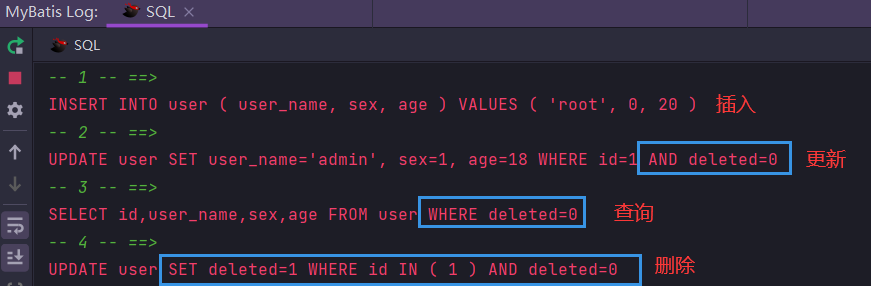 logic-delete-field: deleted # 全局逻辑删除的实体字段名,也可实体类字段上加上@TableLogic注解