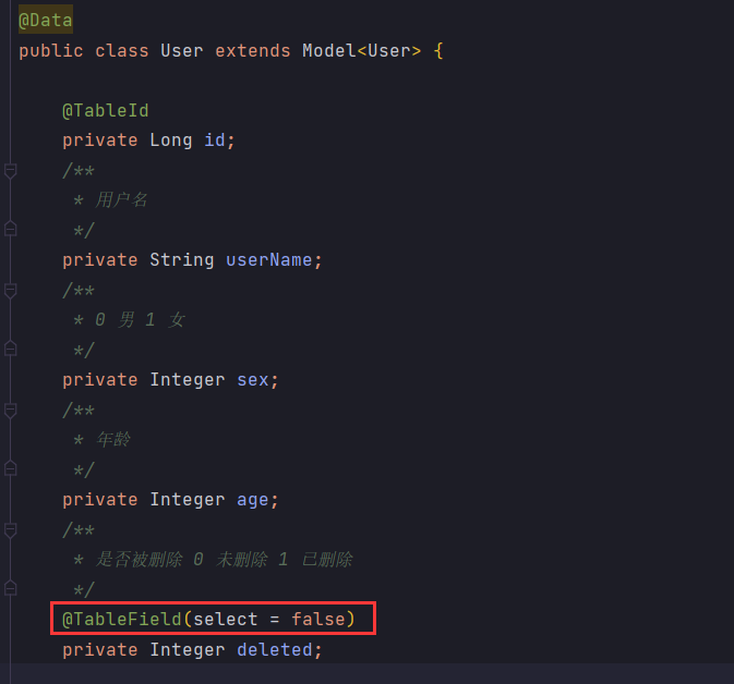 假如在查询的时候不想查询该字段,可以在字段上加上 @TableField(select = false)注解
