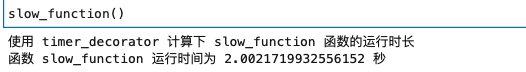 import time # 定义计时器装饰器 def timer_decorator(func): # 定义内部包装函数,用于接收任意数量的位置参数和关键字参数 def wrapper(*args, **kwargs): # 记录函数运行开始时间 start_time = time.time() # 调用原始函数并将结果存储在result中 result = func(*args, **kwargs) # 记录函数运行结束时间 end_time = time.time() # 计算函数运行时间并打印结果 print(f"函数 {func.__name__} 运行时间为 {end_time - start_time} 秒") # 返回原始函数的结果 return result # 返回包装函数 return wrapper @timer_decorator def slow_function(): time.sleep(2) print("使用 timer_decorator 计算下 slow_function 函数的运行时长") slow_function()