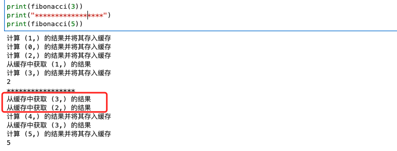 # 定义缓存装饰器 def cache_decorator(func): # 创建一个字典来存储缓存的结果 cache = dict() # 定义内部包装函数,用于接收任意数量的位置参数 def wrapper(*args): # 检查当前参数是否在缓存中 if args in cache: # 如果在缓存中,则从缓存中获取结果并打印提示信息 print(f"从缓存中获取 {args} 的结果") return cache[args] # 如果不在缓存中,则调用原始函数计算结果 result = func(*args) # 将计算结果存储到缓存中,并打印提示信息 cache[args] = result print(f"计算 {args} 的结果并将其存入缓存") # 返回计算结果 return result # 返回包装函数 return wrapper # 使用缓存装饰器修饰fibonacci函数 @cache_decorator def fibonacci(n): if n < 2: return n else: return fibonacci(n-1) + fibonacci(n-2) print(fibonacci(3)) print("*****************") print(fibonacci(5))