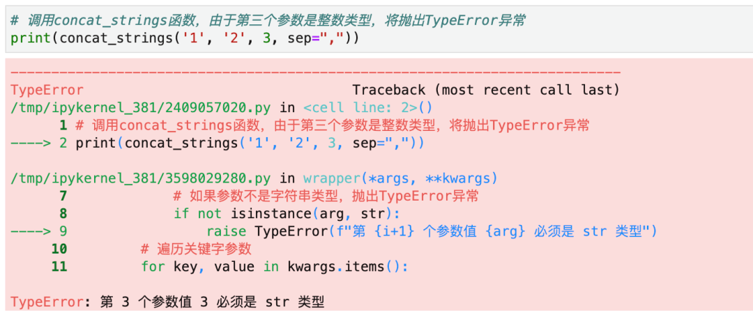 时,类型检查装饰器会自动检查参数类型,并在参数类型错误时抛出异常。
