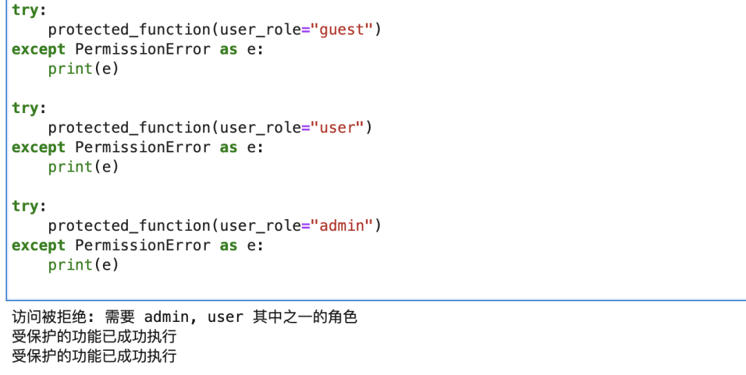 # 定义一个高阶函数,接受一个所需角色列表作为参数 def roles_required(required_roles): # 定义授权装饰器 def authorization_decorator(func): # 定义包装函数,用于接收任意数量的位置参数和关键字参数 def wrapper(*args, **kwargs): # 获取用户角色,默认为"guest" user_role = kwargs.get("user_role", "guest") # 检查用户角色是否在所需角色列表中 if user_role not in required_roles: # 如果不在列表中,抛出一个 PermissionError 异常 raise PermissionError(f"访问被拒绝: 需要 {', '.join(required_roles)} 其中之一的角色") # 如果用户角色在所需角色列表中,调用原始函数并返回结果 return func(*args, **kwargs) # 返回包装函数 return wrapper # 返回授权装饰器 return authorization_decorator # 使用 roles_required 装饰器,允许 admin 和 user 角色的用户访问受保护的功能 @roles_required(["admin", "user"]) def protected_function(user_role="guest"): print("受保护的功能已成功执行") # 尝试使用 guest 角色访问受保护的功能 try: protected_function(user_role="guest") except PermissionError as e: print(e) # 尝试使用 user 角色访问受保护的功能 try: protected_function(user_role="user") except PermissionError as e: print(e) # 尝试使用 admin 角色访问受保护的功能 try: protected_function(user_role="admin") except PermissionError as e: print(e)