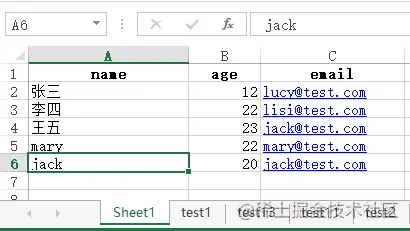 一个 excel 文件,其内容按层次分为工作簿(文件) -> 工作表(sheet) -> 行列 -> 单元格 ,对应上图,整个 excel 文件即是一个工作簿;工作簿下可以有多个工作表(如图中的 Sheet1/test1 等等);工作表中就是对应的表格数据,分为行和列,行是用序号表示,列用大写字母表示(也可用序号);行与列的交点就是每一个存储数据的单元格。