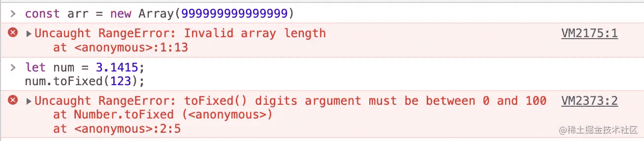 RangeError 表示范围错误。将变量设置在其限定的范围之外、将值传递给超出范围的方法、调用一个不会终止的递归函数时就会抛出此错误。