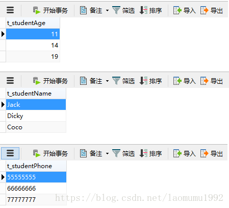 )给学生表的studentName、studentAge、studentPhone三个字段都创建一个触发器表: