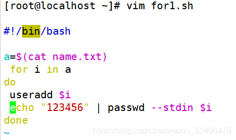 #!/bin/bash a=$(cat name.txt) for i in a do useradd $i echo "123456" | passwd --stdin $i done