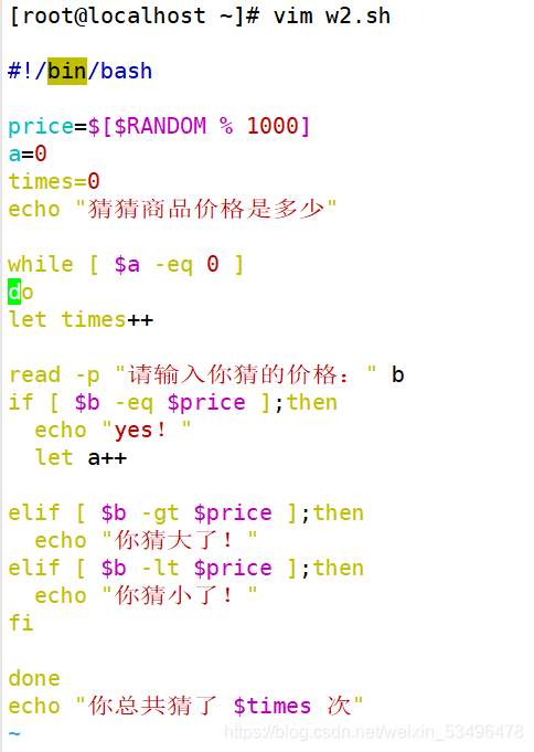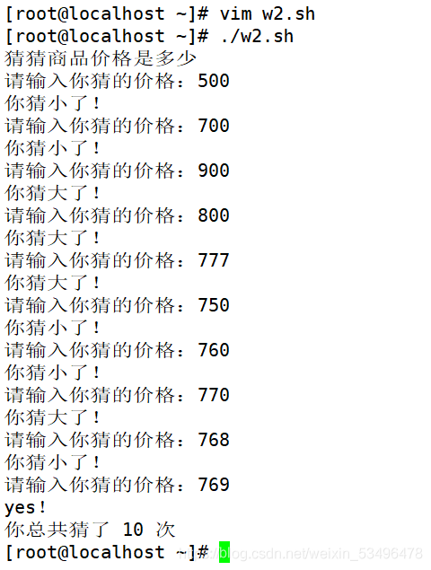 #!/bin/bash price=$[$RANDOM % 1000] a=0 times=0 echo "猜猜商品价格是多少" while [ $a -eq 0 ] do let times++ read -p "请输入你猜的价格:" b if [ $b -eq $price ];then echo "yes!" let a++ elif [ $b -gt $price ];then echo "你猜大了!" elif [ $b -lt $price ];then echo "你猜小了!" fi done echo "你总共猜了 $times 次"