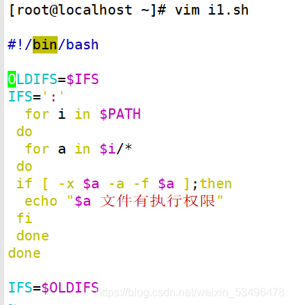 #!/bin/bash OLDIFS=$IFS IFS=':' for i in $PATH do for a in $i/* do if [ -x $a -a -f $a ];then echo "$a 文件有执行权限" fi done done IFS=$OLDIFS