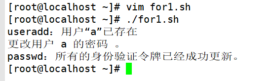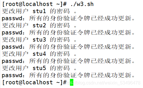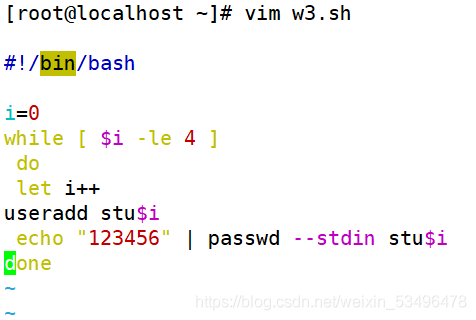 #!/bin/bash i=0 while [ $i -le 4 ] do let i++ useradd stu$i echo "123456" | passwd --stdin stu$i done
