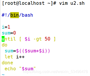 #!/bin/bash i=1 sum=0 until [ $i -gt 50 ] do sum=$(($sum+$i)) let i++ done echo "$sum"