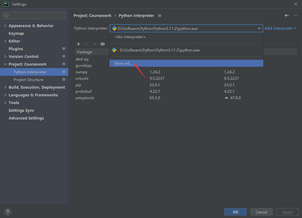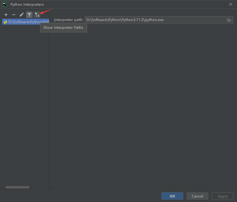 1.打开PyCharm,找到解释器设置:File>Settings>Project:“项目名”>Python Interpreter>Show All,点击Show Interpreter Paths