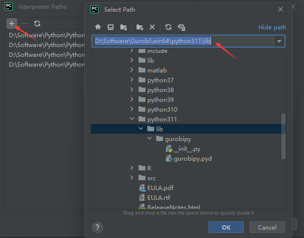 2.添加刚刚在“系统环境变量”中复制的Gurobi环境变量的路径,需要注意的是添加的路径要定位到与Python相对应的版本文件夹中的lib文件夹,Python版本可以在Pycharm的右下角看到