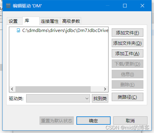 2.5、创建新驱动-“库”界面选择添加文件,添加DM JDBC驱动,然后点击“确定”