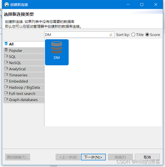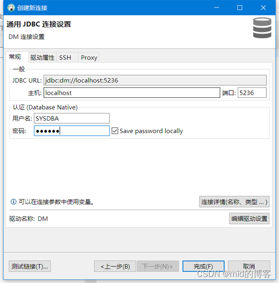 选择“DM”然后根据提示下一步输入账号密码,再点击完成即可连接达梦数据库成功
