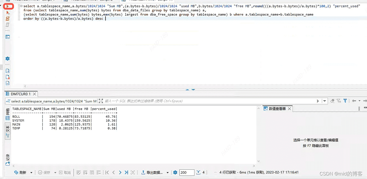 -- 查看表空间使用率 select a.tablespace_name,a.bytes/1024/1024 "Sum MB",(a.bytes-b.bytes)/1024/1024 "used MB",b.bytes/1024/1024 "free MB",round(((a.bytes-b.bytes)/a.bytes)*100,2) "percent_used" from (select tablespace_name,sum(bytes) bytes from dba_data_files group by tablespace_name) a, (select tablespace_name,sum(bytes) bytes,max(bytes) largest from dba_free_space group by tablespace_name) b where a.tablespace_name=b.tablespace_name order by ((a.bytes-b.bytes)/a.bytes) desc